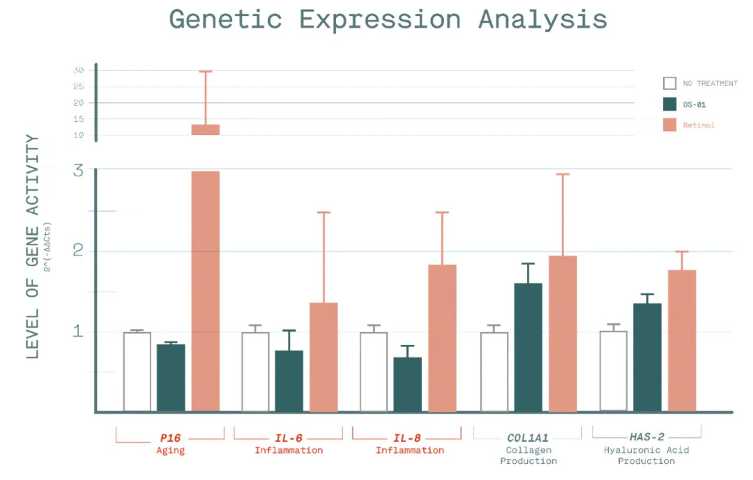 使用 OS-01 与A醇治疗后基因表达分析结果,可以看出OS-01在降低衰老和炎症方面优于A醇,胶原蛋白与透明质酸的生成结果也与A醇相当,图片来自OneSkin官网