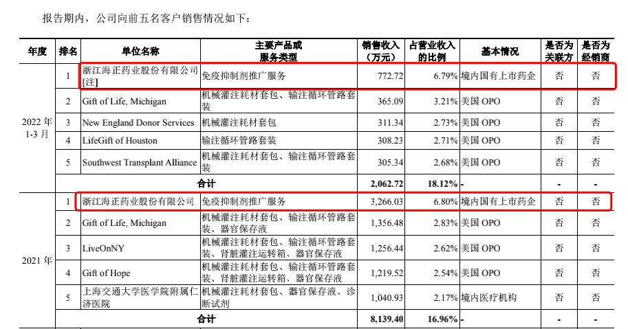 根据招股书,近年来,健耕医药第一大客户均是浙江海正药业,2021年通过为海正药业提供免疫抑制剂推广服务,获得销售收入3266万元,收入占比6.8%,