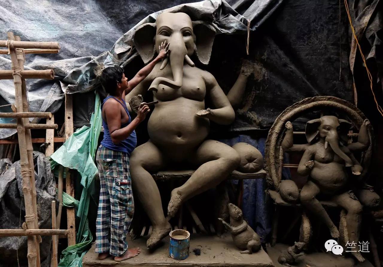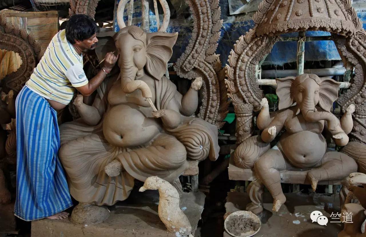 一位艺术家正在节日到来前赶制象头神的泥像