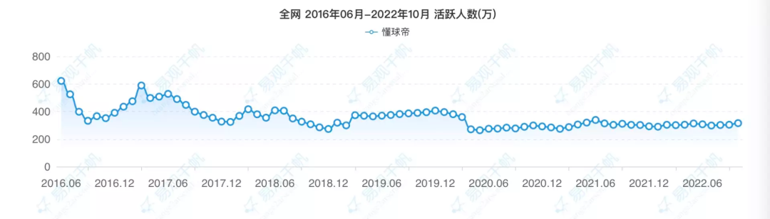 据易观千帆数据显示,懂球帝2022年10月的月活为315万;而上届世界杯举行的2018年6月,月活为408万;更早之前,2016年6月,其月活跃用户曾达到621万。虎扑自今年2月月活达到716万后,也一直在滑坡。