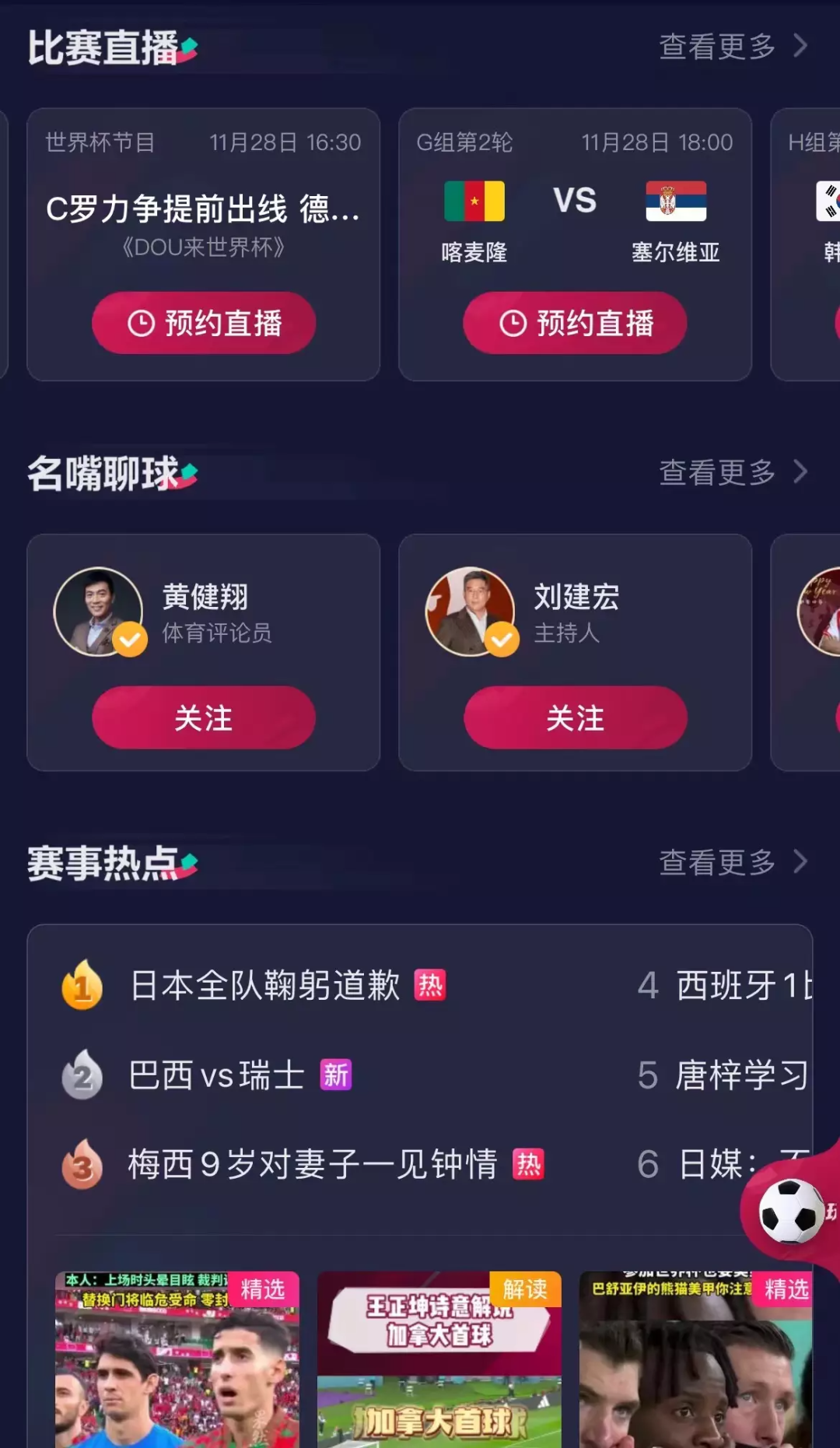 本届世界杯,央视把新媒体平台的赛事转播权分销咪咕和抖音,后者不仅面向所有用户提供“4K超高清免费直播”,还请到了黄健翔、刘建宏、范志毅等人组成“名嘴聊球”,并在直播页面像专业平台一样做了赛程公示、阵容分析、赛事看点、直播聊天。