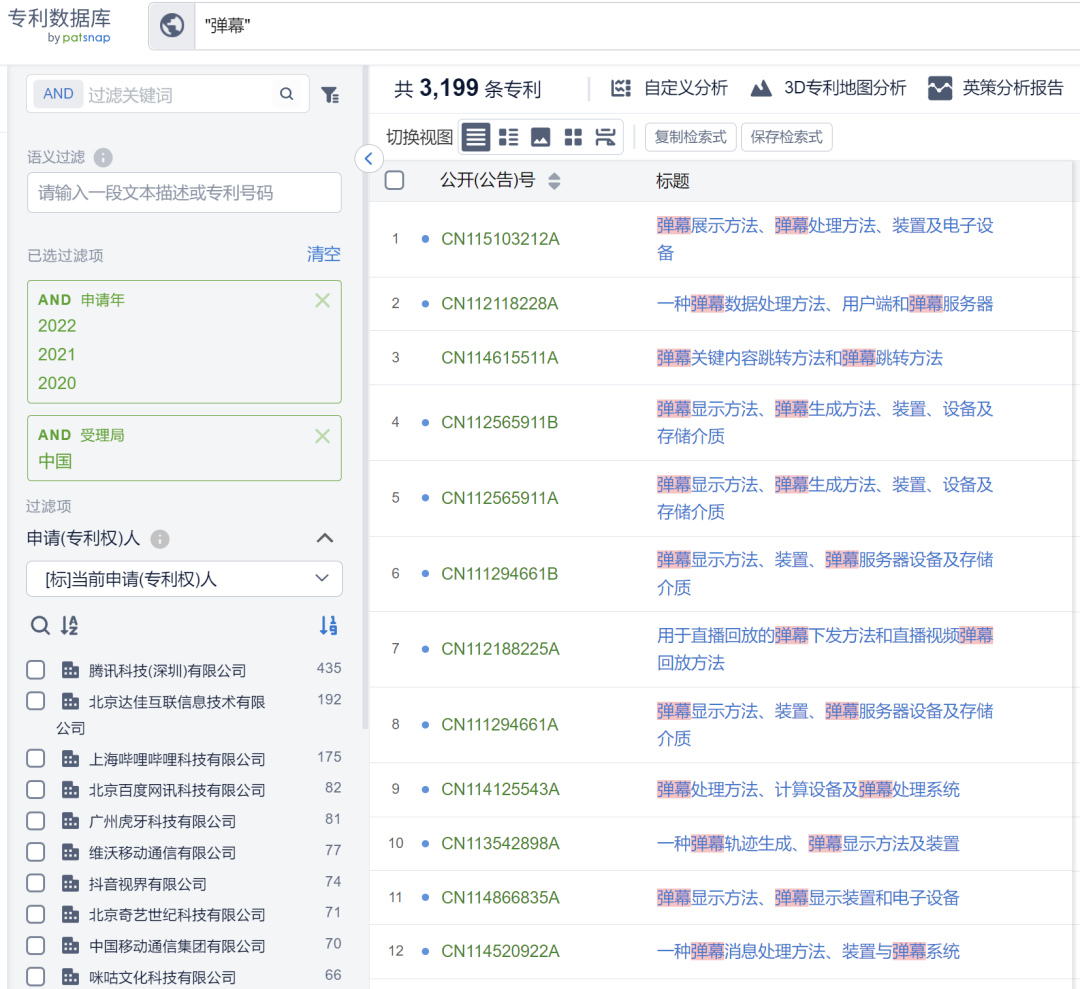 以智慧芽全球专利数据库为基础,以关键词结合国际专利分类(IPC)进行检索,检索日期截止为2022年11月20日并且仅仅只覆盖过去三年,整个检索结果便发现涉及弹幕呈现的发明申请记录共3199条,其中光是腾讯一家申请的各类弹幕专利数量就到达了435项,排在二三位则是快手、B站,同时包括抖音、爱奇艺、虎牙等平台也都有超过70项弹幕专利。