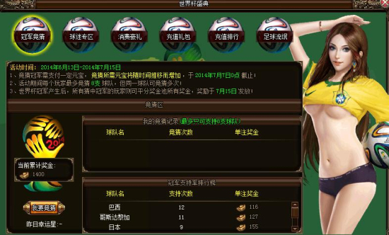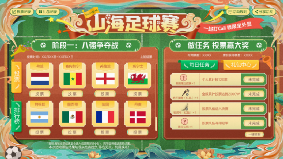 除了在广告素材上做文章,有些游戏还努力在游戏中加入世界杯元素,哪怕游戏本身世界观与足球格格不入也不影响策划的脑洞。其中最常用的方式就是在游戏中搞一个竞猜榜让玩家每天上线猜比分送福利。只要合法合规,这样的活动倒也无可厚非。
