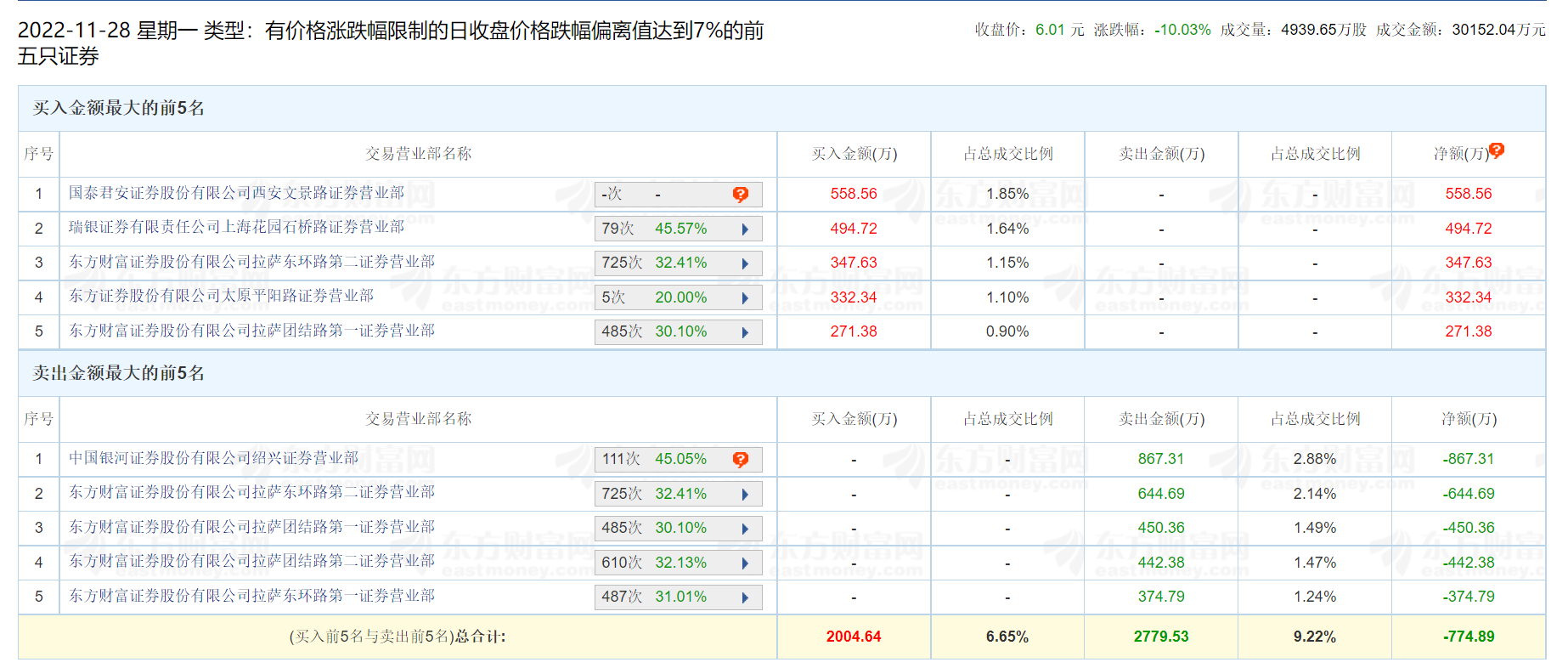 根据11月28日盘后龙虎榜数据,已有知名游资大笔出货。卖出方面,“赵老哥”常用席位中国银河绍兴以867.31万元成交额居卖方第一位,其余四席均为“散户大本营”东方财富拉萨东环路和团结路。买入方面,西安本地资金国泰君安西安文景路以558.56万元成交额居买方第一位,另一家实力营业部瑞银证券上海花园石桥路以494.72万元成交额居买方第二位,买方第三位和第五位分别为东方财富拉萨东环路和团结路。