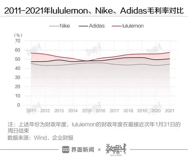 以lululemon为例,其瑜伽裤单价过千元,几乎是耐克的两倍左右;过去十年,lululemon毛利率始终高于耐克、阿迪达斯;2021年财年,lululemon毛利率为57.7%,分别比耐克和阿迪达斯高出12.9个百分点、7个百分点。