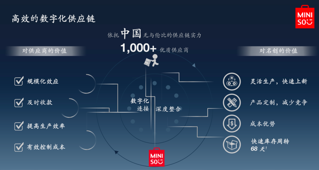 目前,名创优品手握1000多家前端供应商,两者关系极为紧密,一是采购量比较大,实现“以量定价”,二是名创优品打款速度极快,三是需求稳定,由此,供应商愿意给出最大让利,名创优品的成本得以极致压缩。