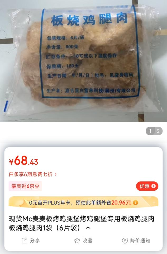 潘哥在京东发现,有部分商家,在售卖麦当劳半成品。这其中,麦麦板烧鸡腿肉,6片装售价68元;麦麦巨无霸牛肉饼,15片售价110元;50块一袋的麦乐鸡,售价78元;麦当劳汉堡皮,六对售价28元;2公斤麦麦细薯条,售价55元。而500毫升的可口可乐,24瓶售价59.9元。