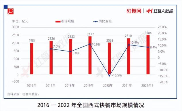 潘哥根据红餐网出版的,《中国餐饮发展报告2022》显示:2017年至2019年,中国西式快餐市场规模增长缓慢,增长速度分别为7%、5%、10.9%;而在2020年,由于受到疫情影响,西式快餐甚至出现了负增长,市场规模下降了15.5%。