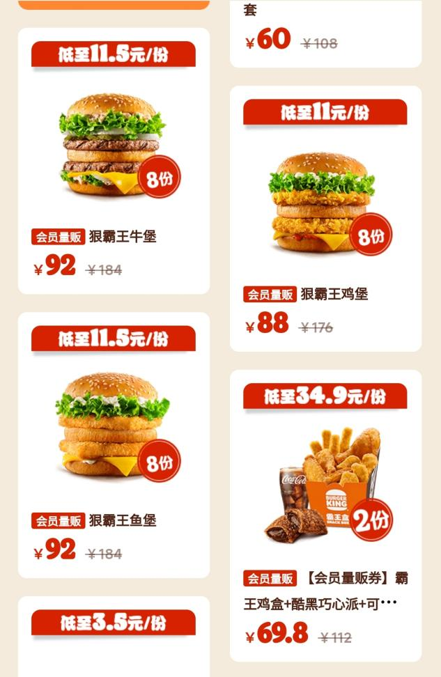 同时,汉堡王还推出了会员批发优惠,8份狠霸王牛堡,会员价92元,折合11.5元一个;8份狠霸王鸡堡,会员价88元,相当于11元一个。