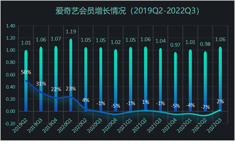 在2021年四季度之前,爱奇艺曾连续10个季度会员数均在1亿以上。财报显示,爱奇艺第三季度日均订阅会员总数为1.01亿,2021年同期为1.047亿,2022年第二季度为9830万,同比和环比均下降3.5%。