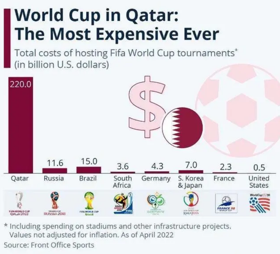 卡塔尔世界杯的投入与前面七届世界杯的对比 图据statista