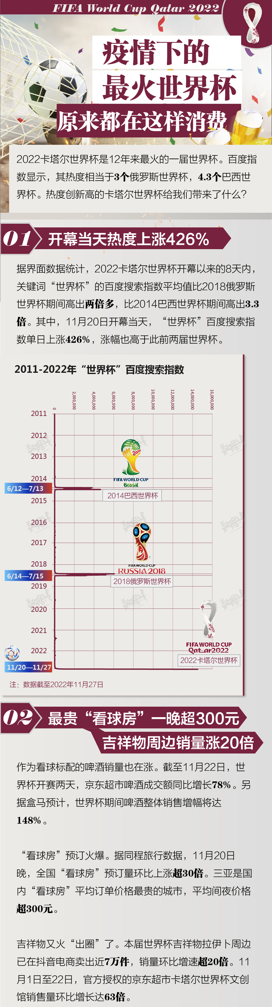 2022卡塔尔世界杯是12年来最火的一届世界杯。百度指数显示,其热度相当于3个俄罗斯世界杯,4.3个巴西世界杯。