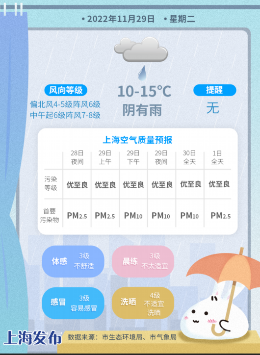 寒潮29日早晨开始影响本市,29日气温最高值出现在早晨前后,最高气温15度左右,早间出门感觉还不是太冷,但白天气温一路下滑,傍晚以后气温跌至10度以下,中午起陆上偏北风增大至6级阵风7-8级。阵阵寒风加上一整天阴阴雨雨,湿冷魔法攻击开启。晚归的朋友最好穿上御寒防风的衣物,出行注意防范大风的危害。