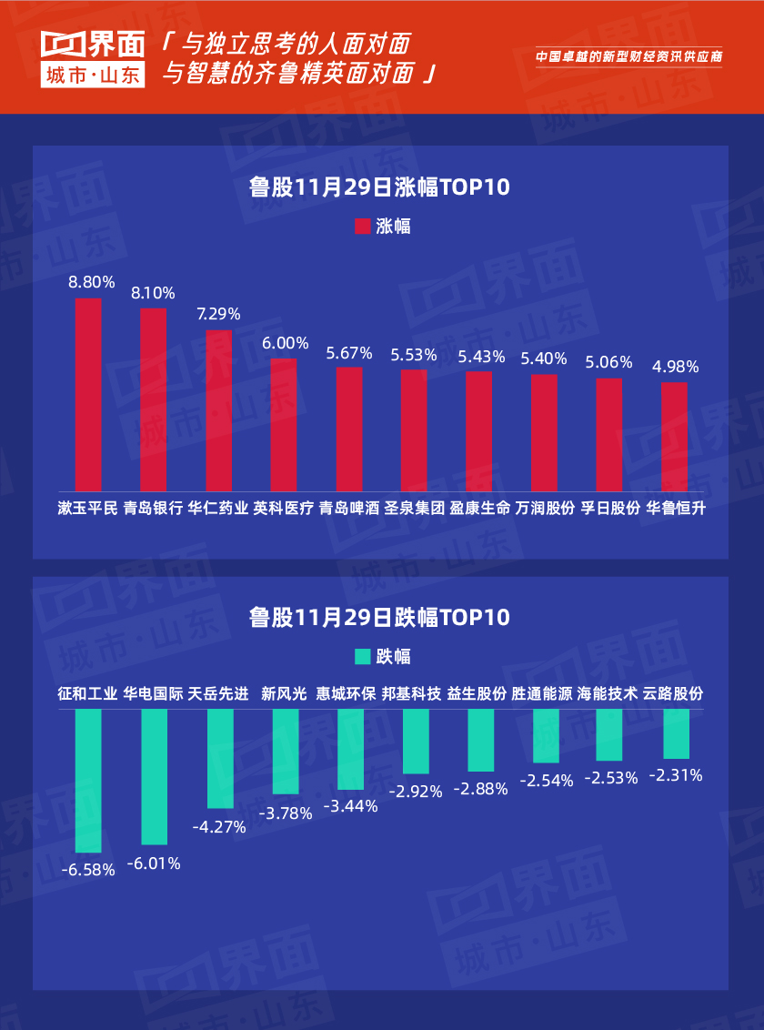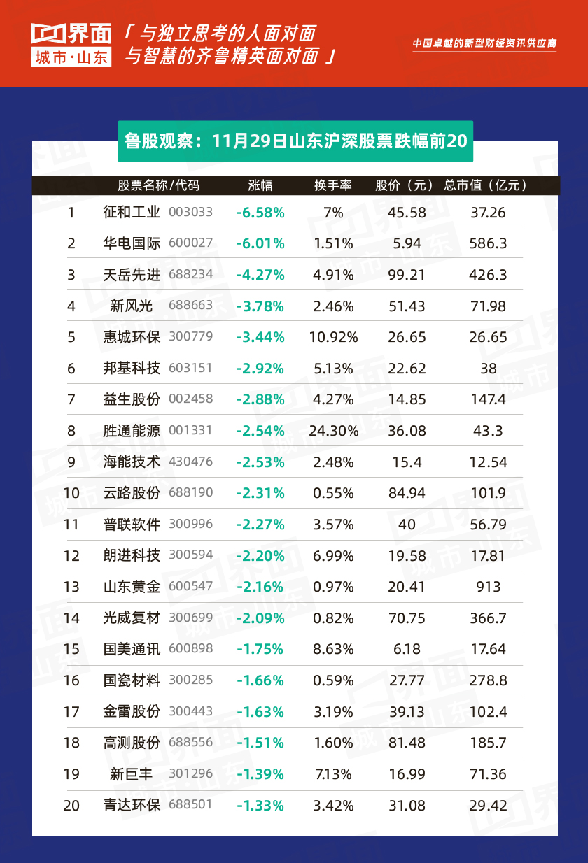 青岛市跌幅榜首:征和工业(003033),跌幅6.58%,股价45.58元,总市值37.26亿元;