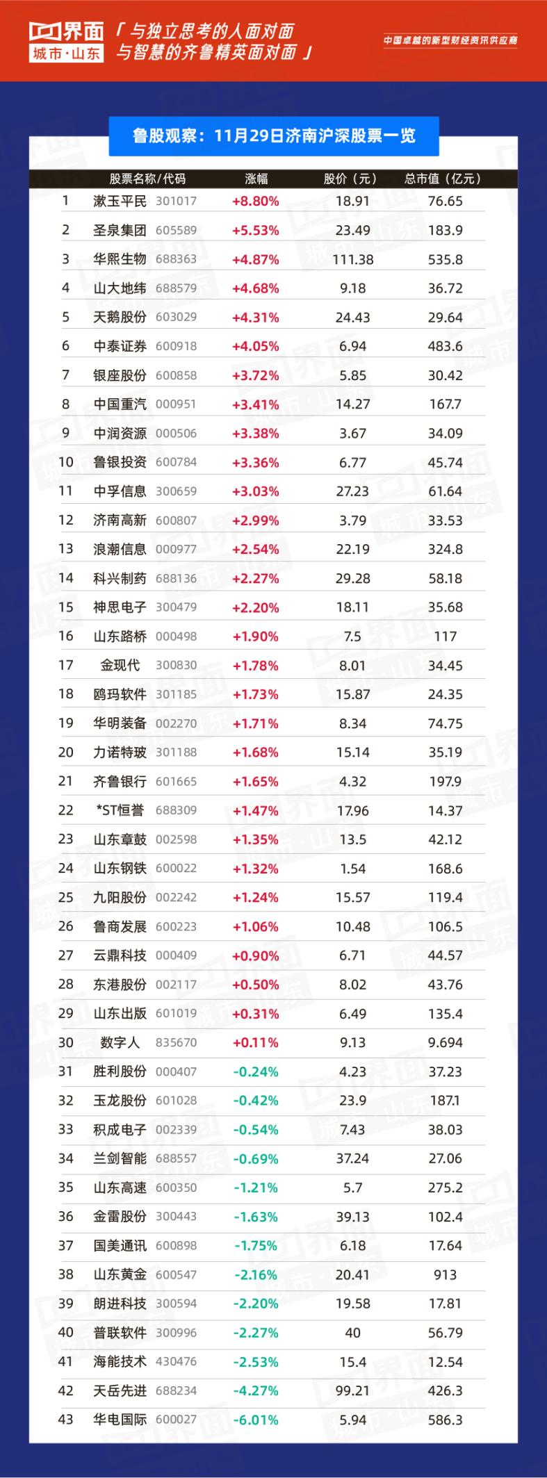 烟台市涨幅榜首:万润股份(002463),涨幅5.4%,股价16.6元,总市值154.4亿元;