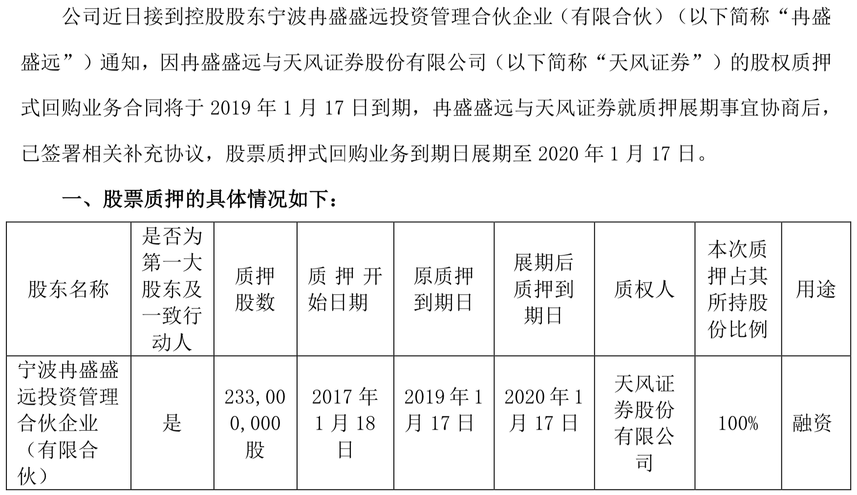 另外,按照约定,上述质押的2.33亿股原本应在2019年1月进行回购,后展期至2020年1月。至今,冉盛盛远这2.33亿股仍在质押中。