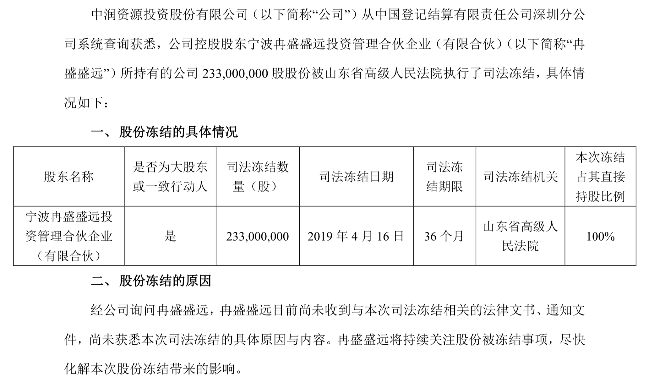 在质押展期间,2019年4月16日,冉盛盛远这2.33亿股又被山东省高级人民法院司法冻结,冻结时间为36个月。