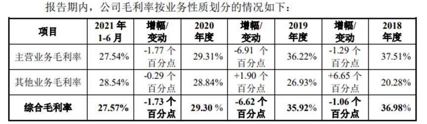 再看毛利率,2018年-2021年上半年,阿宽食品主营业务毛利率分别为37.51%、36.22%、29.31%和27.54%;剔除执行新收入准则产生的影响后,公司主营业务毛利率分别为37.51%、36.22%、36.30%和34.53%,呈现下滑态势。