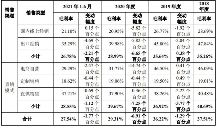 数据显示,报告期内阿宽食品经销模式的毛利率分别为35.26%、35.64%、28.99%和26.78%,直销模式毛利率则分别为40.69%、36.92%、29.67%和28.55%。