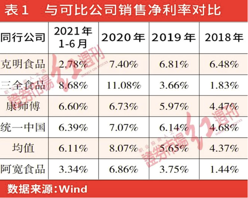 2021年上半年,阿宽食品的净利润明显下滑,香颂资本执行董事沈萌曾表示,这既说明其申请上市前可能存在刺激业绩成长的行为,也可能其在市场竞争中的议价能力不强,为了营收增长必须牺牲部分利润。