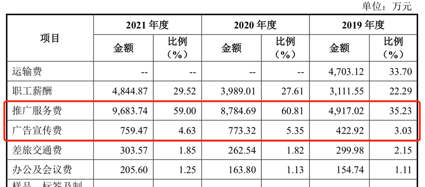 招股书显示,2019年,阿宽食品推广服务费和广告宣传费合计为5339.94万元,到了2021年两者合计1.04亿元,接近翻倍。在推广服务费中,又属电商渠道服务费增长较快,从2019年的2342.9万元增长到2021年的6673.4万元。