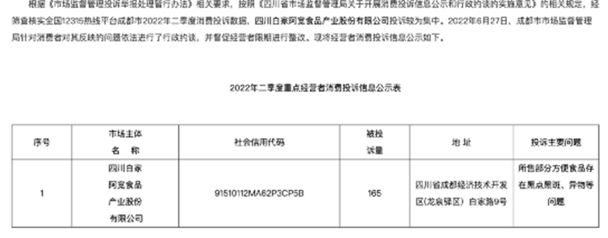 今年6月,成都市市场监督管理局发布的《2022年二季度重点经营者消费投诉信息公示》显示,经筛查核实全国12315热线平台成都市2022年二季度消费投诉数据,四川白家阿宽食品产业股份有限公司投诉较为集中,相关投诉量达165条,投诉的主要问题为"所售部分方便食品存在黑点黑斑、异物等"。