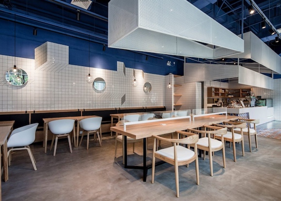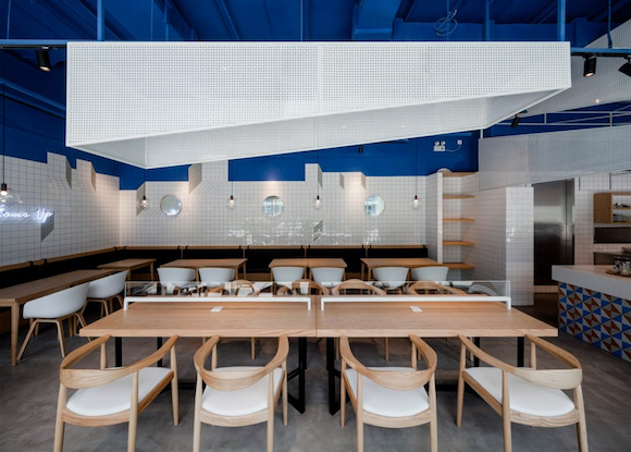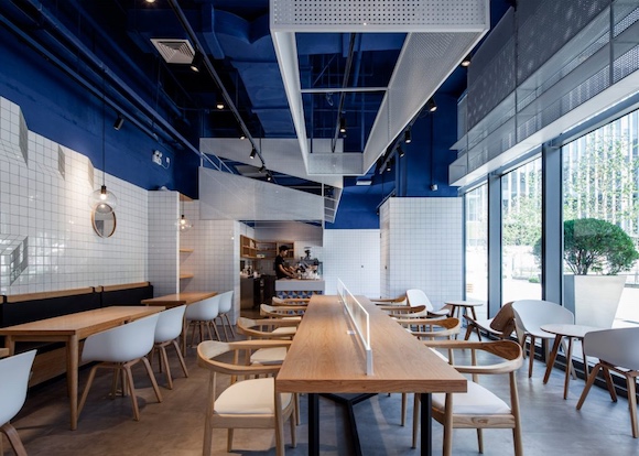 这个为了配合写字楼外观而不得不采用玻璃钢架门脸的咖啡馆,在内饰上为营造“轻松氛围”下了大功夫。设计工作室三也室内设计从地中海的美景中获得灵感,以蓝色和白色作为空间的主要装饰颜色,再选用了现代风格的木制家具,让整个空间给人以海边度假的轻快感觉。