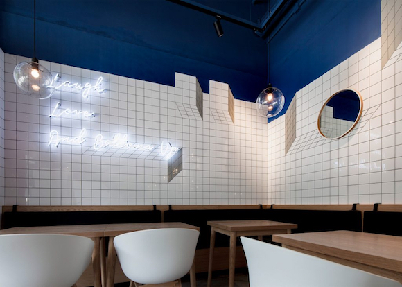 空间设计的细节也很值得细细品味。不论是马赛克砖块铺出的视觉错位立方体,又或是装在墙上字母霓虹灯,还有用镜子倒映吊灯做出的多重光源的视觉效果,都让每一个顾客在静下心来环顾空间时,能不断发现新的惊喜。