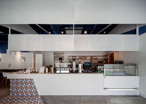 实际上,这是这家咖啡馆在上海开出的第二家分店。设计师特意考虑到了咖啡馆品牌统一性的需求,将两个空间在设计上做了延续。比如吧台附近的彩色纹路地砖就与第一家分店的地砖一模一样。而在墙上镶嵌霓虹灯字母的点子也是取自第一家分店的设计。
