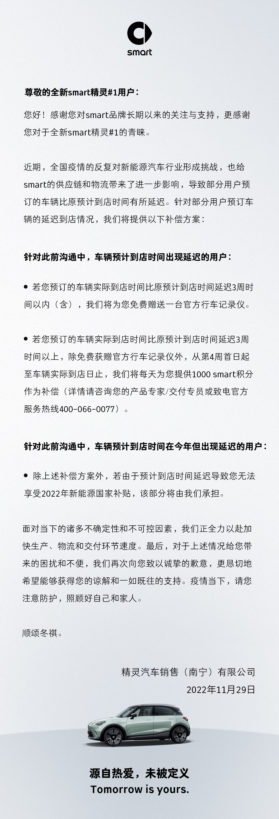 11月29日晚间,smart中国官博发布smart精灵#1交付相关声明,称因供应链和物流影响,导致部分用户预订的车辆比原预计到店时间有所延迟,公司将提供相应补偿。