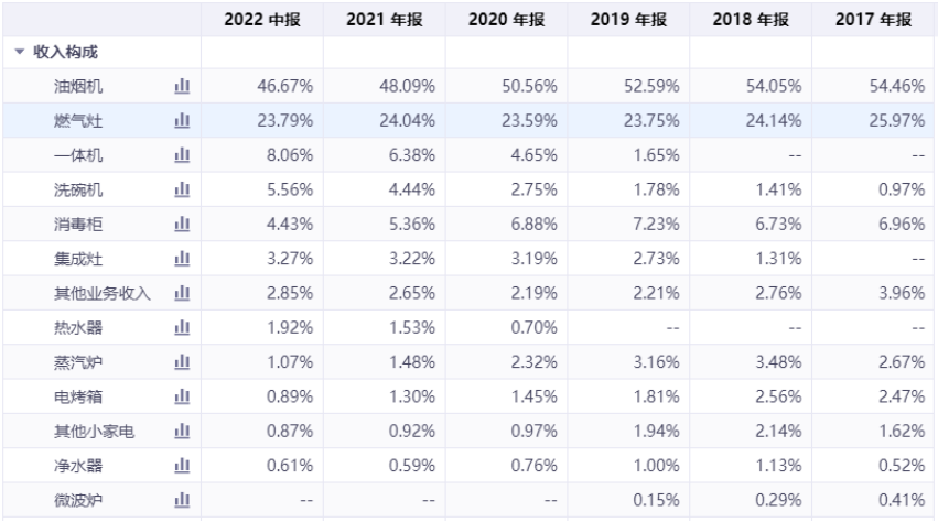 从营收构成上看,厨电三大件(吸油烟机、燃气灶及消毒柜)一直是老板电器的核心业务。2018年以前,三者营收合计占比超过85%。