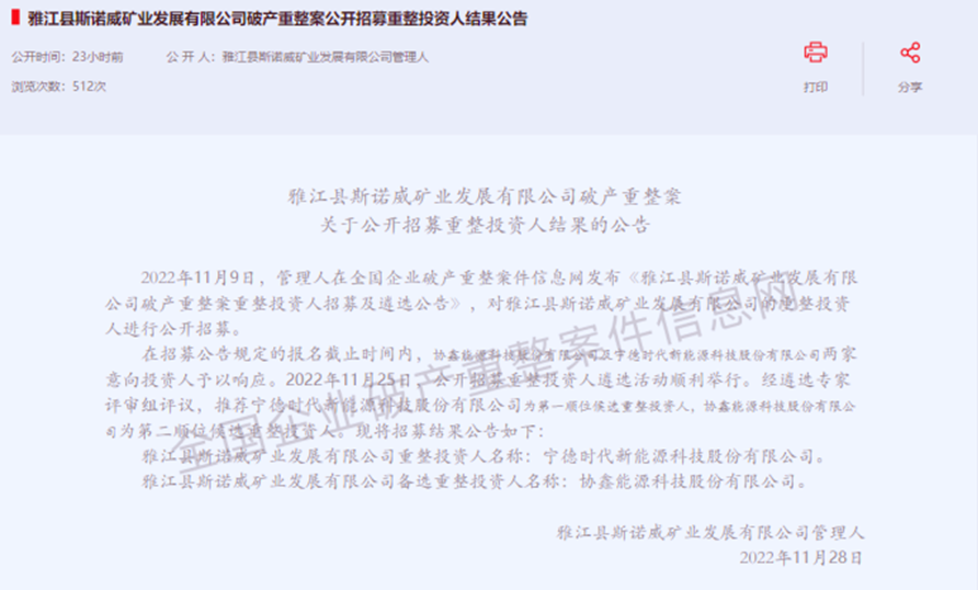 11月28日,斯诺威管理人宣布,11月25日斯诺威公开招募重整投资人遴选活动举行,经遴选专家评审组评议,宁德时代为第一顺位候选重整投资人,协鑫能科为第二顺位候选重整投资人。