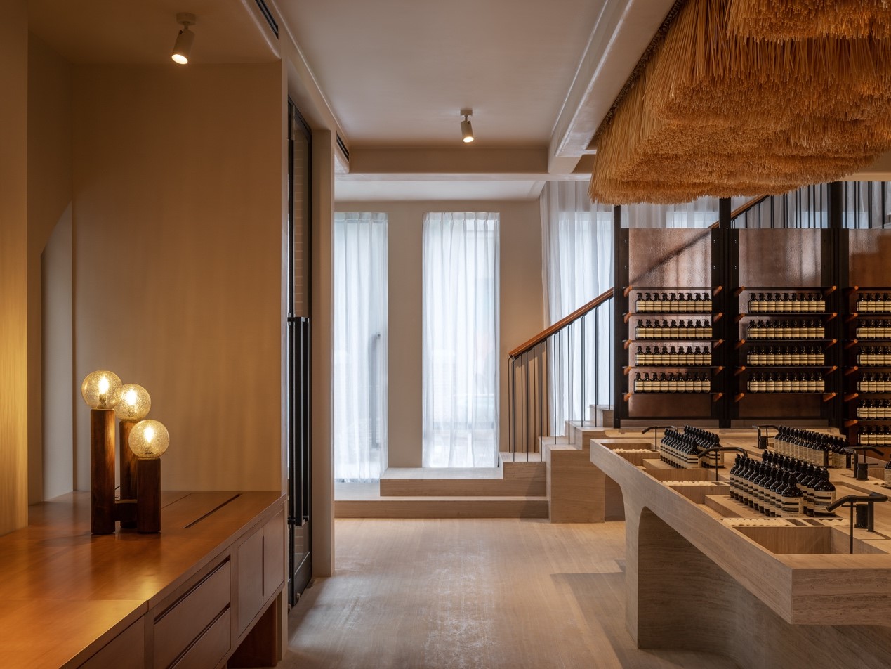 店铺在保留老建筑原始设计的同时,更向中国工艺致敬,创造出既熟悉又特别的空间景观。 以贵州开采的石材雕琢为几何形状的家具陈列,呈现出悠然自得的空间氛围。采撷自当地的麦秆则悬挂于空间顶部,如同一片被倒置的原野,亦兼作空间内的枝形吊灯。为了向附近住宅的艺术玻璃装饰致敬,空间特别运用了具有隐蔽感的艺术玻璃屏风,光线穿过其不规则的纹理,温柔地舞动变化、发散开来。