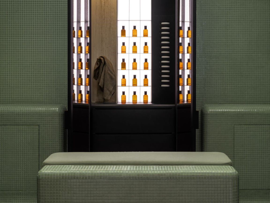 东平路上的伊索“香氛空间”被打造成了一间浴室,铺满单色瓷砖的房间之中藏有两座“香氛衣柜”,隐藏着Aesop伊索香水系列世界。在这里,充满好奇心的香氛爱好者们,可以细嗅散发着香气的陶瓷圆盘,还能为衣物浸染钟意的香气。