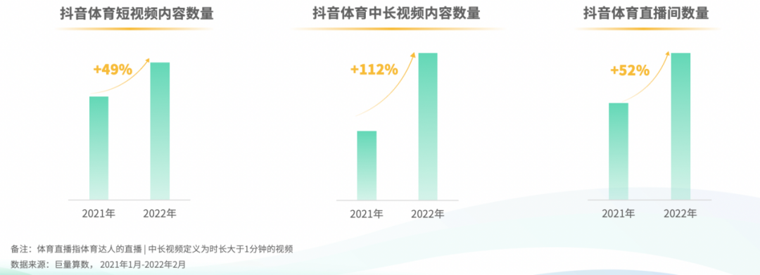 根据《2021抖音体育生态白皮书》显示,截至2022年初,抖音站内共计有近5亿体育类兴趣用户和超6万体育内容万粉创作者,累计投稿 5000 万篇专业内容,体育直播的开播数量和观看人次增长约50%,体育行业各领域头部资源账号覆盖率达70%。