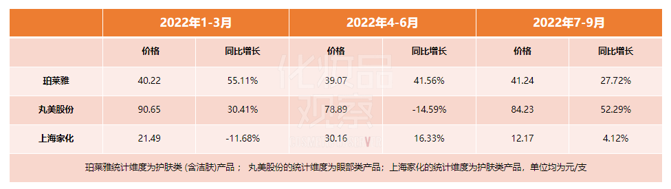 根据珀莱雅、上海家化、丸美等三家企业的财报,其主打产品均有不同程度的价格上浮。比如,前三季度,珀莱雅护肤类(含洁肤)产品价格实现了三连涨,Q1至Q3的涨幅分别为55.11%、41.56%、27.72%。上海家化、丸美股份则均有两个季度实现价格上涨。其中,丸美股份眼部产品价格在第三季度实现了52.29%的上调,而上海家化护肤类产品则在第二季度实现了16.33%的增长。