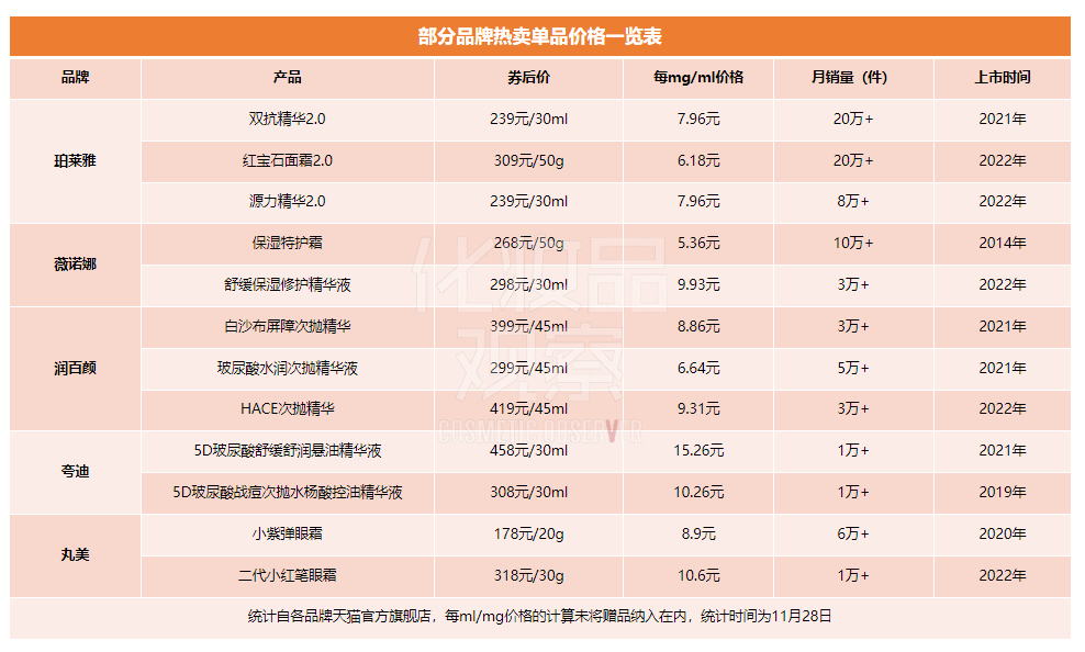 比如,统计部分国货热销单品(见下表)可以看到,珀莱雅、薇诺娜、润百颜等当下热销的明星单品,券后价已几乎都在300元左右徘徊,部分甚至突破了400元,而这些产品几乎以2020年之后上市的居多。此外,部分产品单位规格(每ml/mg)的单价已然突破10元,夸迪5D玻尿酸舒缓舒润悬油精华液甚至超过15元,这已接近雅诗兰黛/兰蔻等品牌部分产品单位规格的价格。