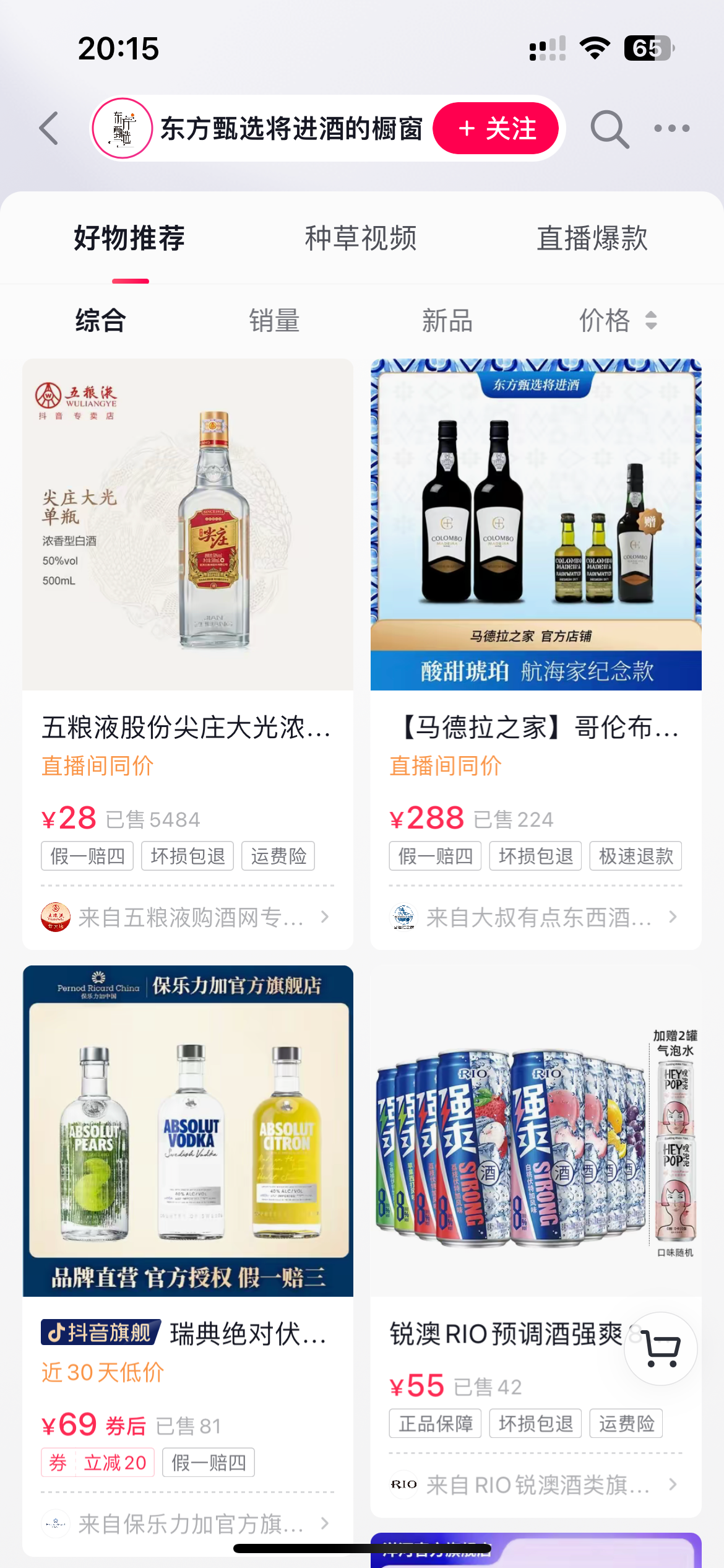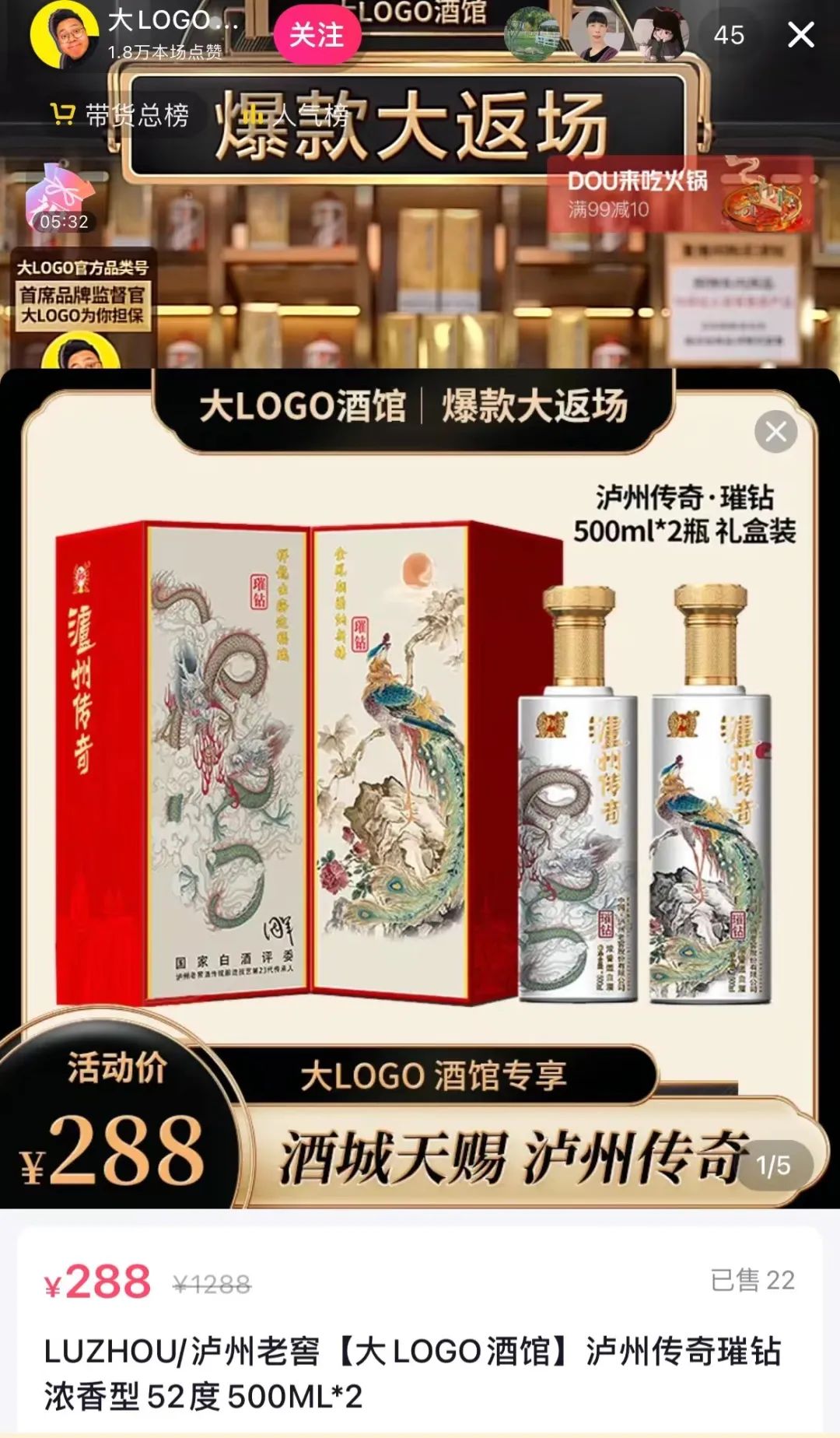 酒讯登录抖音发现,在综合主播大LOGO的直播间中,直播销售的产品价格主要集中于100-200元价格带,部分产品涉及500-800元价格带。“今天直播间价格相当给力,不信你去搜一搜。泸州老窖传奇璀璨酒,不要1288、不要888,只要288元,抓紧时间去拍。”该酒水主播在直播间喊道。