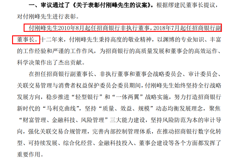 根据招行公告,自2010年8月起,付刚峰任职招商银行非执行董事,2018年7月起任招商银行副董事长。截至辞职前,付刚峰担任该行高管已有12年时间。