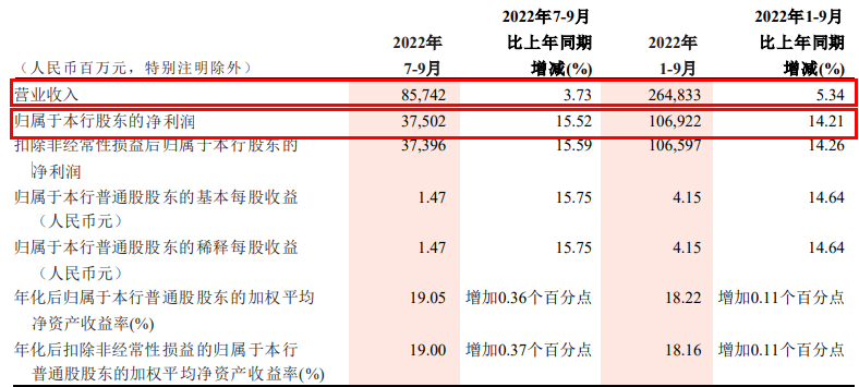 第三季度,招商银行净利润375.02亿元,同比增长15.52%,营业收入857.42亿元,同比增长3.73%。