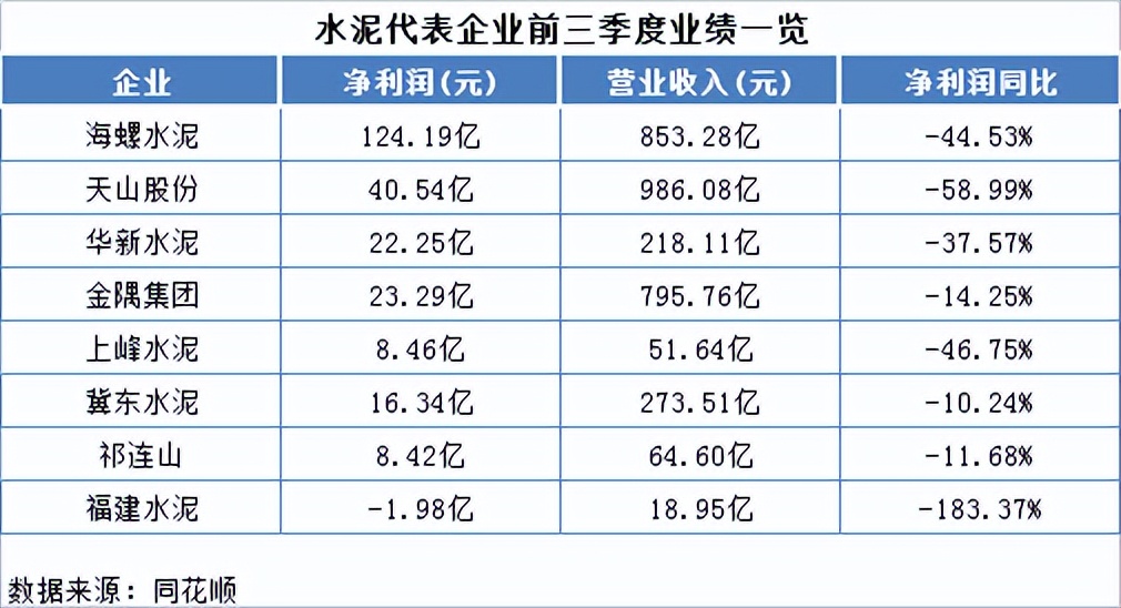 同花顺数据显示,在36家水泥上市公司中,仅10家实现净利润同比增长,其他水泥公司前三季度净利润同比纷纷下滑,甚至福建水泥(600802.SH)、亚泰集团(600881.SH)等5家企业出现不同程度的亏损。