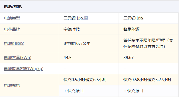 动力系统、智能互联上旗鼓相当,在座椅配置上保持一致,电池容量低但也有补救措施:慢充快一个小时、首任车主能够享受无限期的电池组质保。