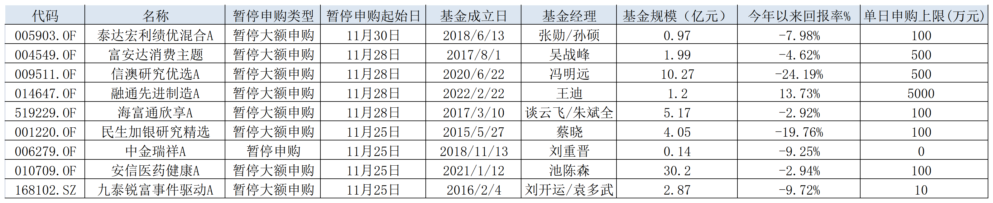 以知名基金经理冯明远管理的信澳研究优选为例,11月28日,该基金公告显示,为保护基金份额持有人的利益,基金暂停大额申购(含转换转入、定期定额投资),单日单账户累计申购最高额度为500万元。