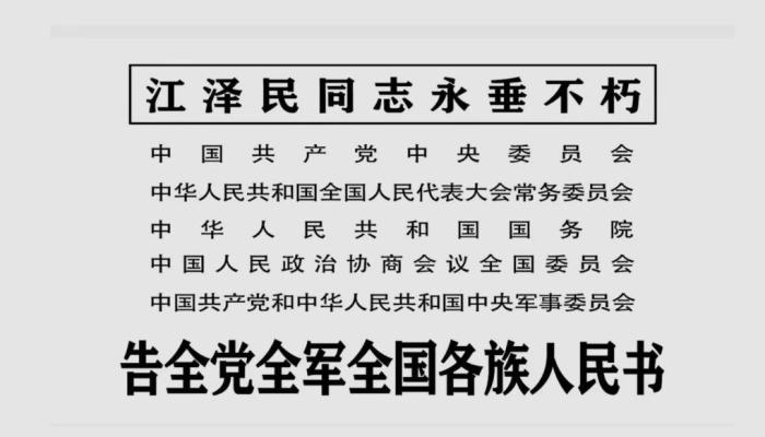 中国共产党中央委员会、中华人民共和国全国人民代表大会常务委员会、中华人民共和国国务院、中国人民政治协商会议全国委员会、中国共产党和中华人民共和国中央军事委员会,极其悲痛地向全党全军全国各族人民通告:我们敬爱的江泽民同志患白血病合并多脏器功能衰竭,抢救无效,于2022年11月30日12时13分在上海逝世,享年96岁。