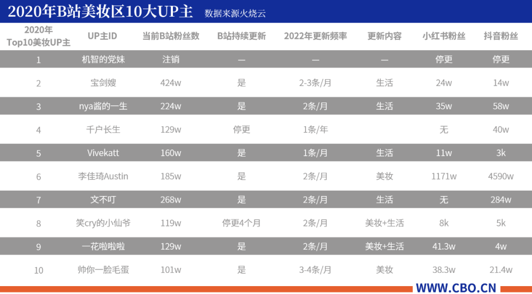 以2020年的10大(粉丝数排名)美妆UP主为样本,可以看到: