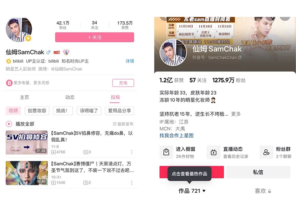 2019年,@仙姆SamChak 从彩妆师转型成为全职美妆博主,五大平台同步运作,到目前,B站粉丝数为42万,合计282个视频,平均播放量约3k;抖音粉丝数1276w,合计721个视频,平均播放量都以万为单位,商品橱窗已带货10万+件。