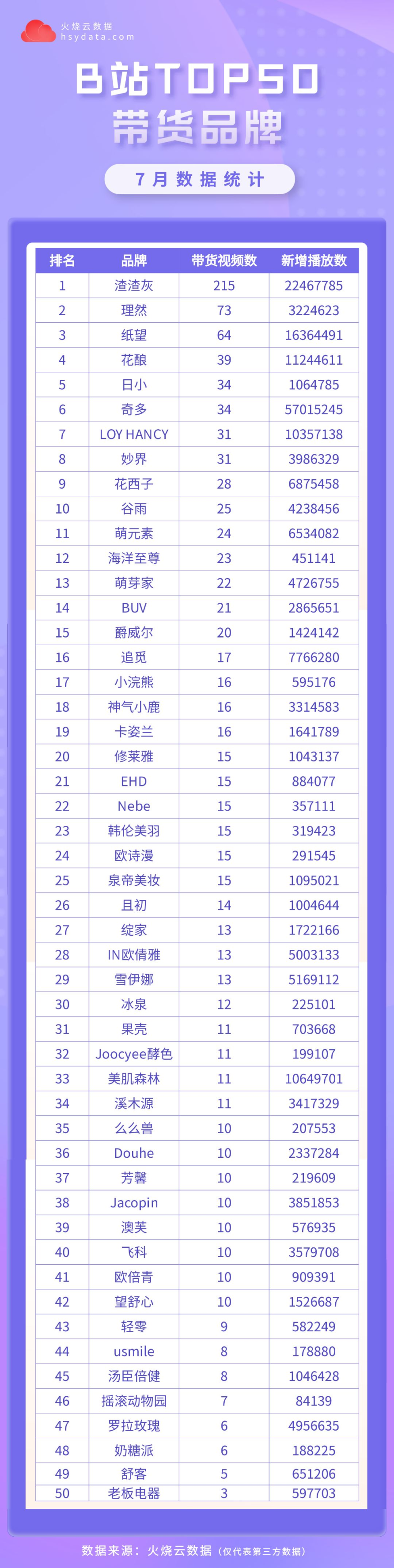 以今年7月蓝链带货top50品牌为例,排名靠前的护肤品牌依次为:理然、花酿、loy hanc、花西子、谷雨、海洋至尊、buv、爵威尔……多为新生的白牌。值得注意的是,投放最多的理然还在今年上半年拿到了B站的投资。