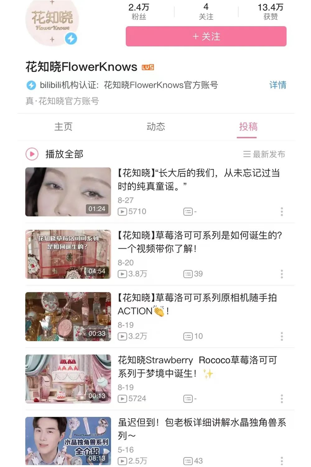现在,知名美妆品牌在B站,更看重品牌形象和调性传递,而非直接的ROI转化。比如花知晓官方例行投放新品,珀莱雅官方投放的情感营销视频等。