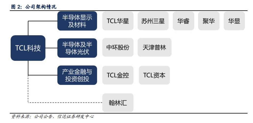 公开资料显示,TCL科技的TCL科技主要业务分为显示面板、新能源光伏及半导体新材料、产业金融和其他四大部分。其中,前面两部分为公司营收主力,对应的子公司分别为TCL华星和TCL中环。
