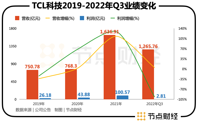 以最为重要的TCL科技(000100.SZ)为例,不久前发布的三季度财报显示,报告期内,其总营业收入为1265.76亿元,同比增长4.5%;实现归母净利润2.81亿元,同比下降96.9%。